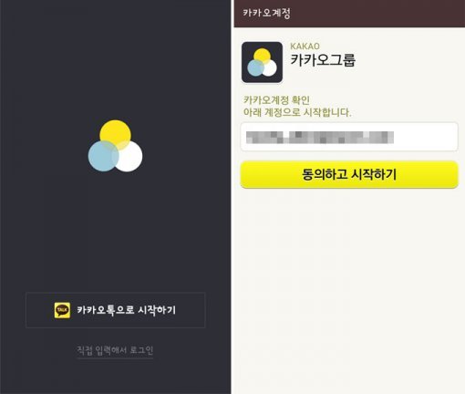 카카오그룹을 처음 실행하면 화면 하단에 ‘카카오톡으로 시작하기’ 버튼이 있을 것이다. 카카오계정을 확인하고 ‘동의하고 시작하기’ 버튼을 누르면 서비스를 사용할 수 있다.