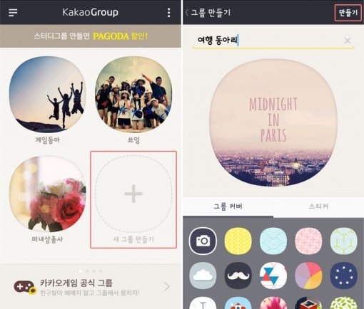 카카오그룹 서비스를 이용하려면 모임을 만들어야 한다. 카카오그룹에서 ‘새 그룹 만들기’ 버튼을 누르면 모임을 개설할 수 있다. 그룹 이름을 입력하고, 그룹 커버 이미지를 선택하고 스티커도 붙여보자. 다 됐다면, 화면 상단 오른쪽에 있는 ‘만들기’ 버튼을 누르면 된다. ‘그룹을 만드시겠습니까?’라는 안내창이 나타나면 ‘예’를 누른다.