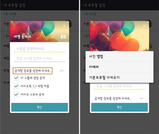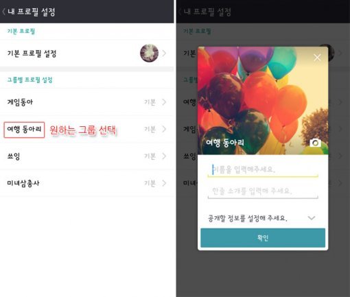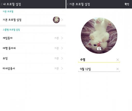 ‘내 프로필 설정 메뉴’에서 기본 프로필뿐만 아니라 그룹별 프로필도 설정할 수 있다. 원하는 그룹을 선택하고 사진, 이름, 한 줄 소개를 입력하면 된다. 친한 친구들이 모인 그룹이라면 별명을, 연인과 함께하는 그룹이라면 애칭을, 격식을 차려야 하는 모임에서는 본명을 쓰는 등, 각각의 그룹에 맞춰 자신을 표현할 수 있다.