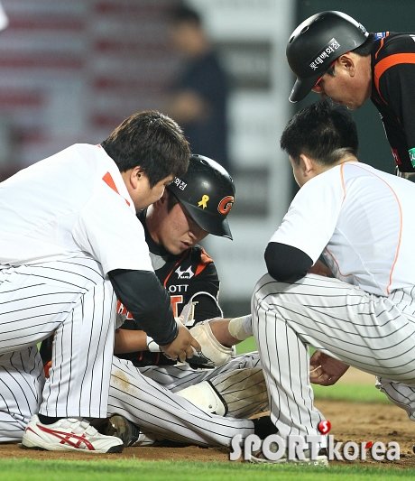 13일 오후 부산 사직구장에서 열린 ‘2014 한국 야쿠르트 세븐 프로야구’ 롯데 자이언츠와 KIA 타이거즈의 경기 4회말 무사 상황에서 롯데 정훈이 KIA 박준표의 투구에 맞고 고통스러워하고 있다.