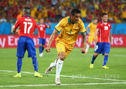 호주의 팀 케이힐이 14일(이하 한국시간) 브라질 쿠이아바의 아레나 판타날 경기장에서 열린 2014 브라질 월드컵 조별리그 B조 첫 경기 칠레와의 경기에서 전반 35분 만회골을 넣은 뒤 환호하고 있다.