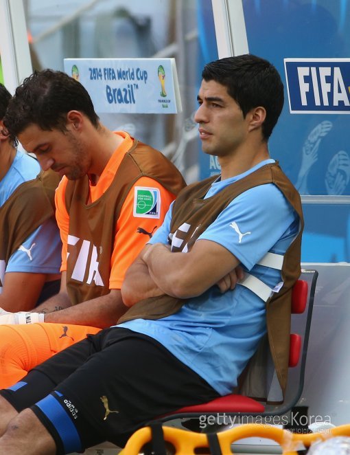 우루과이의 루이스 수아레스가 15일(한국시간) 브라질 포르탈레자의 에스타디오 카스텔라오 경기장에서 열린 2014 브라질 월드컵 D조 첫 경기 코스타리카전에서 벤치에 앉아 경기를 지켜보고 있다.