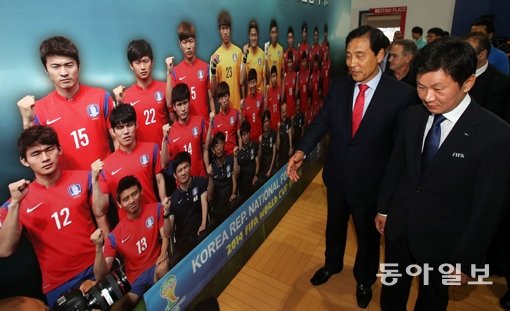 한국축구가 단기간에 비약적 성장을 이룰 수 있었던 데는 범 현대가(家)의 축구 사랑이 큰 힘이 됐다. 대한축구협회 정몽규 회장(앞줄 오른쪽)이 하나은행 김정태 회장(앞줄 왼쪽)과 함께 14일(한국시간) 브라질 이구아수 플라멩고 스타디움에서 열린 ‘코리아 하우스’ 개관식에 참석해 내부를 둘러보고 있다. 월드컵 베이스캠프에 미디어센터가 문을 연 것은 이번이 처음이다. 이구아수|양회성 동아일보 기자 yohan@donga.com