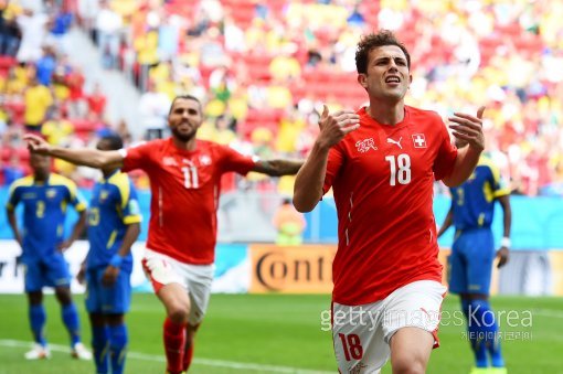 스위스의 아드미르 메메디가 16일(한국시간) 브라질 브라질리아의 에스타디오 나시오날 데 브라질리아 경기장에서 열린 2014 브라질 월드컵 E조 스위스-에콰도르 경기에서 후반 3분 동점골을 넣은 뒤 환호하고 있다.