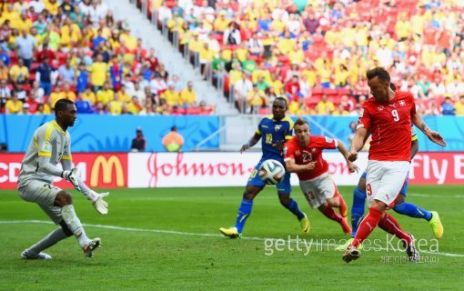 스위스의 하리스 세페로비치가 16일(한국시간) 브라질 브라질리아의 에스타디오 나시오날 데 브라질리아 경기장에서 열린 2014 브라질 월드컵 E조 스위스-에콰도르 경기에서 후반 추가시간 때 결승골을 넣고 있다.