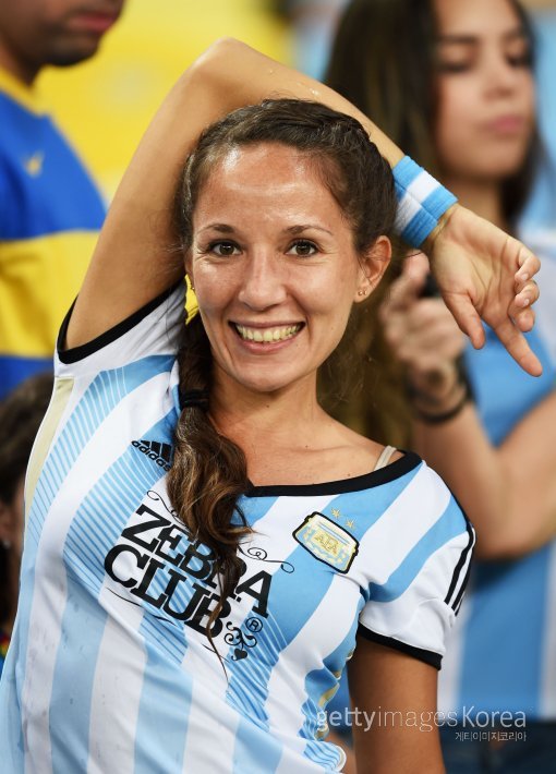 아르헨티나의 한 여성 팬이 16일(한국시간) 브라질 리우데자네이루의 에스타디오 두 마라카낭 경기장에서 열리는 2014 브라질 월드컵 F조 아르헨티나와 보스니아 헤르체고비나 경기에 앞서 환하게 웃고 있다.