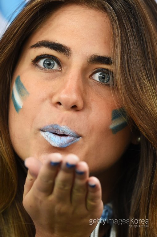 아르헨티나의 한 여성 팬이 16일(한국시간) 브라질 리우데자네이루의 에스타디오 두 마라카낭 경기장에서 열리는 2014 브라질 월드컵 F조 아르헨티나와 보스니아 헤르체고비나 경기에 앞서 카메라를 향해 포즈를 취하고 있다.