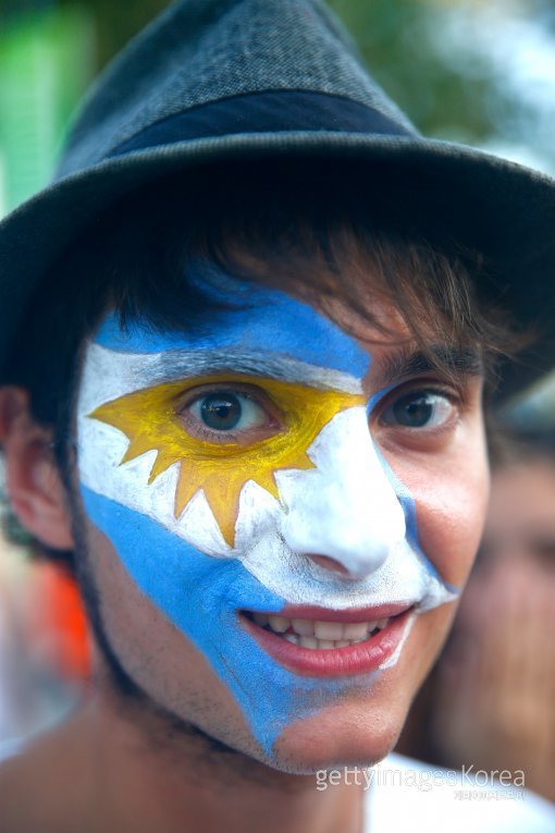 아르헨티나의 한 남성팬이 16일(한국시간) 브라질 리우데자네이루의 에스타디오 두 마라카낭 경기장에서 열린 2014 브라질 월드컵 F조 아르헨티나와 보스니아 헤르체고비나 경기에서 페이스 페인팅을 한 채 응원하고 있다.