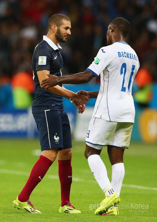 프랑스-온두라스전에서 멀티골의 주인공 카림 벤제마가 상대 선수와 악수를 나누고 있다.