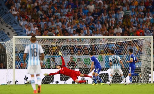 리오널 메시가 16일(한국시간) 브라질 리우데자네이루의 에스타디오 두 마라카낭 경기장에서 열린 2014 브라질 월드컵 F조 아르헨티나와 보스니아 헤르체고비나 경기에서 결승골을 넣고 있다.