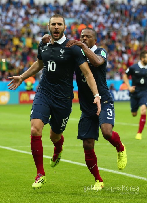 프랑스-온두라스전에서 멀티골의 주인공 카림 벤제마와 대표팀 동료 파트리스 에브라가 골을 넣고 환호하고 있다.