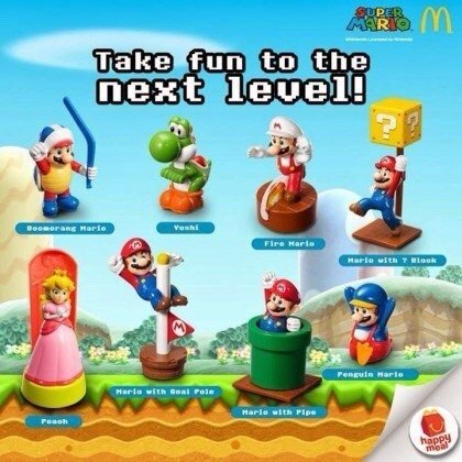 해피밀 슈퍼마리오 2차 판매 제품은 파이어마리오·부메랑마리오·피치공주·요시로 구성된 슈퍼마리오 4종 캐릭터 피규어로, 맥도날드 해피밀 세트 구매시 제공된다.