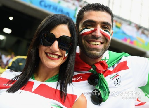이란 팬들이 17일(한국시간) 브라질 쿠리치바의 아레나 다 바이사다 경기장에서 열린 2014 브라질 월드컵 F조 이란-나이지리아 경기에서 열띤 응원을 하고 있다.