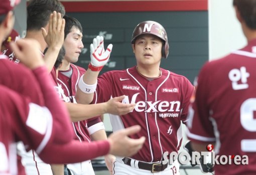 17일 오후 광주 기아 챔피언스필드에서 열린 ‘2014 프로야구’ KIA 타이거즈 대 넥센 히어로즈 경기 2회초 1사에서 넥센 윤석민이 KIA 선발 임준섭을 상대로 좌월 솔로홈런을 쳐 홈을 밟은 후 덕아웃 동료선수들의 환영을 받고 있다.