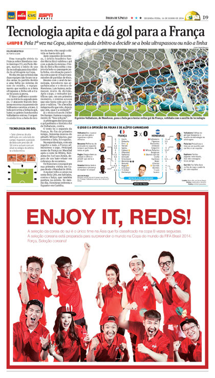 전체적으로 빨간색 디자인에 대한민국 공식 응원문구인 ‘즐겨라, 대한민국!(ENJOY IT, REDS!)’을 헤드라인으로 강조했다. 포르투갈어로 ‘아시아에서 유일하게 8회 연속 월드컵 본선에 진출한 대한민국! 이번 브라질 월드컵에서도 전 세계를 놀라게 할 준비가 되어 있다. 힘내라! 대한민국!’이라는 내용도 덧붙였다. 광고에는 ‘무한도전’ 멤버를 비롯해 손예진과 정일우, 개그맨 지상렬, B1A4의 바로와 애프터스쿨의 리지 등 ‘무한도전 응원단’이 참여했다.