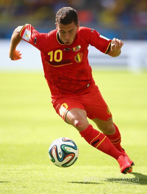 18일(한국시간) 브라질 벨루오리존치의 에스타디오 미네이랑 경기장에서 열린 2014 브라질 월드컵 H조 예선 벨기에와 알제리의 경기 장면. 벨기에의 에덴 아자르가 드리블 하고 있다.