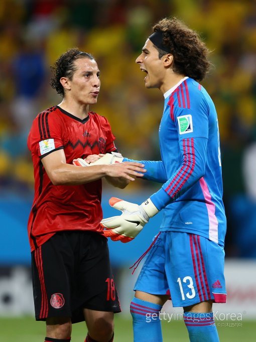멕시코 골키퍼 기예르모 오초아(오른쪽)가 18일(한국시간) 브라질 포르탈레자의 에스타디오 카스텔라오 경기장에서 열린 2014 브라질 월드컵 A조 예선 2차전 브라질-멕시코 경기에서 상대 슈팅을 막아낸 뒤 동료의 격려를 받고 있다.