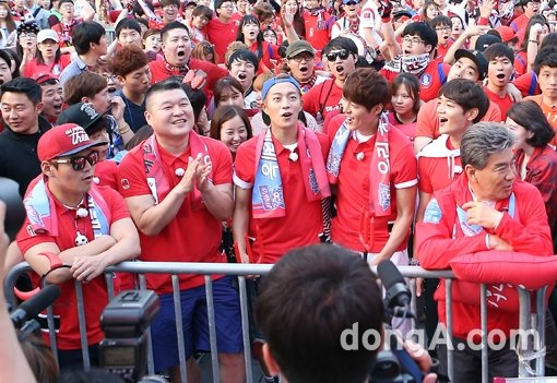 ‘우리동네 예체능’ 출연자들이 18일 오전 서울 세종로 특설무대에서 진행된 '2014 브라질 월드컵 거리응원전'에서 응원을 펼치고 있다.