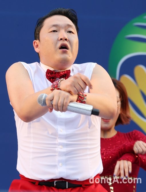 국제가수 싸이가 2014 브라질 월드컵 H조 1차 조별 예선 대한민국과 러시아 경기를 앞둔 18일 오전 서울 강남구 코엑스 영동대로에서 축구팬들과 응원을 펼치고 있다.