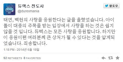 팬들의 항의가 빗발치자 듀렉스 코리아는 "태연, 백현의 사랑을 응원한다는 글을 올렸었습니다. 아이돌이 대중의 주목을 받는 입장에서 사랑하는 것은 쉽지 않을 것입니다. 듀렉스는 모든 사랑을 응원합니다. 하지만 이 응원이 팬 여러분께 큰 상처가 될 수 있다는 것을 알게 되었습니다. 죄송합니다"라며 공식 사과했다.