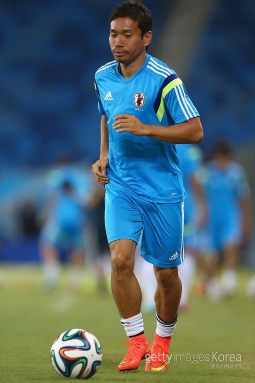일본의 나가토모 유토가 19일(한국시간) 브라질 나타우의 에스타디오 다스 두 나스 경기장에서 열린 팀 훈련에서 몸을 풀고 있다.