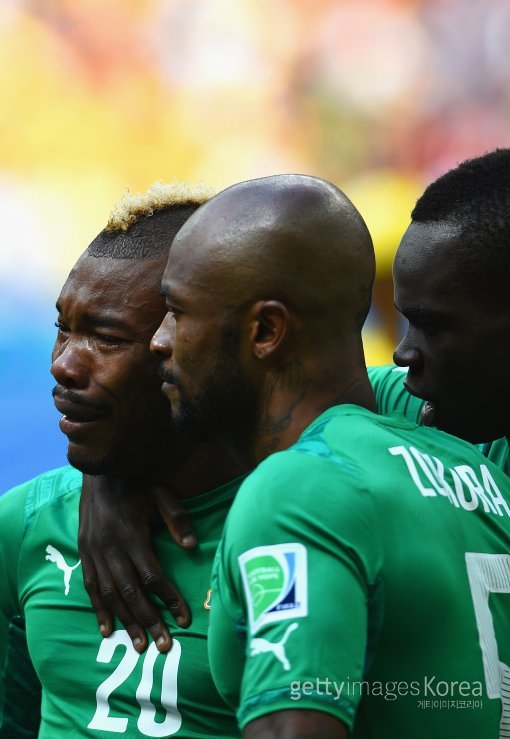 20일(한국시간) 브라질 브라질리아의 에스타디오 나시오날 데 브라질리아 경기장에서 열린 2014 브라질 월드컵 C조 예선 2차전 콜롬비아-코트디부아르 경기. 코트디부아르의 세레이 디에(왼쪽)가 경기전 국가 연주 도중 눈물을 흘리고 있다.