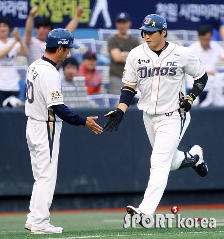 20일 오후 마산야구장에서 열린 ‘2014 프로야구’ NC 다이노스 대 삼성 라이온즈 경기 1회말 2사에서 NC 나성범이 삼성 선발 백정현을 상대로 우월 솔로홈런을 친 후 그라운드를 돌며 이광길 3루코치의 환영을 받고 있다.