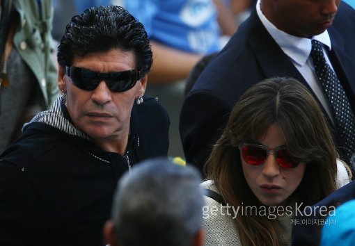 아르헨티나 축구의 ‘전설’ 디에고 마라도나가 그의 딸 지안니나 마라도나와 22일(한국시간) 2014 브라질 월드컵 조별리그 F조 2차전 아르헨티나와 이란의 경기가 열린 브라질 벨루오리존치의 에스타디오 미네이랑 경기장을 찾았다.