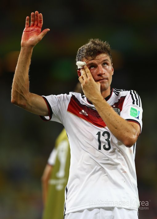 22일(한국시간) 브라질 포르탈레자의 에스타디오 카스텔라오 경기장에서 열린 2014 브라질 월드컵 조별리그 G조 2차전 독일과 가나의 경기. 독일의 토마스 뮐러가 후반 경기 도중 상대 선수와 부딪히며 피를 흘리고 있다.
