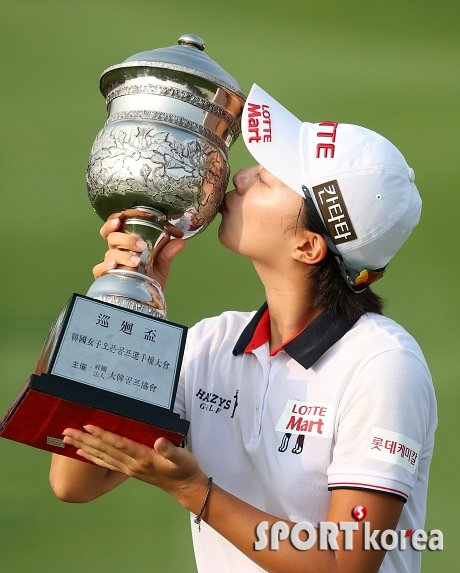 22일 오후 인천 청라지구 베어즈베스트 청라골프클럽(파72.6476야드)에서 열린 ‘기아자동차 제28회 한국여자오픈 골프선수권대회’ 최종라운드에서 김효주(19, 롯데)가 버디 1개, 보기 3개를 엮어 2오버파 74타를 기록하며 생애 첫 메이저대회 우승을 거머쥐었다. 시상식 후 트로피를 끌어 안고 키스하고 있다.