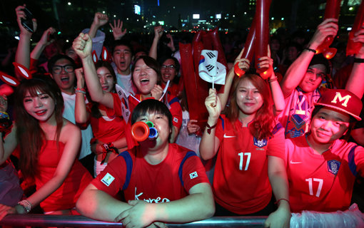 브라질월드컵 밤샘 야외 응원을 할 때는 건강관리에 주의해야 한다. 특히 딱딱한 아스팔트 바닥에 장시간 앉아있으면 척추와 고관절에 무리가 간다. 허리를 세워 앉고, 틈틈이 스트레칭을 통해 긴장된 근육을 풀어줘야 한다. 18일 열린 브라질월드컵 러시아와 1차전 때 길거리 응원 모습. 스포츠동아DB