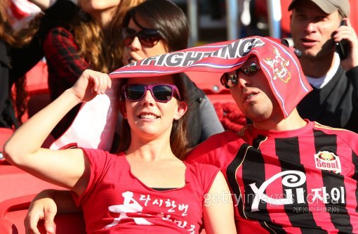 23일(한국시간) 브라질 포르투 알레그리의 에스타디오 베이라-리오 경기장에서 열린 2014 브라질 월드컵 조별리그 H조 2차전 한국-알제리 경기에서 팬들이 열띤 응원을 하고 있다.