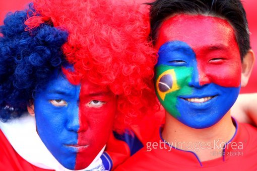 23일(한국시간) 브라질 포르투 알레그리의 에스타디오 베이라-리오 경기장에서 열린 2014 브라질 월드컵 조별리그 H조 2차전 한국-알제리 경기에서 팬들이 열띤 응원을 하고 있다.