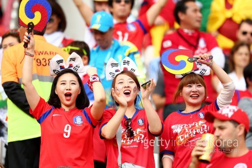 23일(한국시간) 브라질 포르투 알레그리의 에스타디오 베이라-리오 경기장에서 열린 2014 브라질 월드컵 조별리그 H조 2차전 한국-알제리 경기에서 팬들이 열띤 응원을 하고 있다.