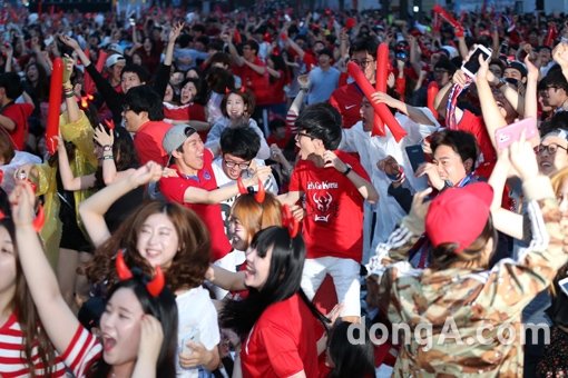 2014 브라질 월드컵 조별그리 대한민국과 알제리전이 열린 23일 오전 서울 광화문 광장에서 시민들이 대한민국 골이 터지자 환호하고 있다. 이날, 대한민국은 4대 2로 패했다.