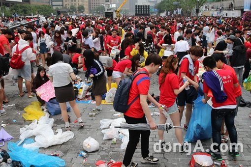 2014 브라질 월드컵 조별그리 대한민국과 알제리전이 열린 23일 오전 서울 광화문 광장에서 시민들이 길거리 응원을 마친 뒤 일상으로 복귀하고 있다. 이날, 대한민국은 4대 2로 패했다.
