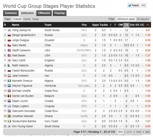 러시아 전에서 6회로 가장 많은 클리어를 기록했던 김영권(24·광저우 에버그란데)은 알제리 전에서 10회의 클리어를 기록하며 총 16회 경기당 8회로 20위에 이름을 올렸다. 20위 내에 아시아 선수는 홍정호, 김영권과 이란의 잘랄 호세이니 뿐이다.