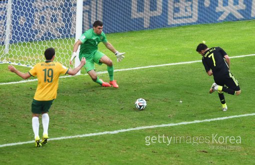 24일(한국시간) 브라질 쿠리치바의 아레나 다 바이사다 경기장에서 열린 2014 브라질 월드컵 조별리그 B조 최종 3차전 호주-스페인 경기. 스페인의 다비드 비야가 전반 36분 선제골을 넣고 있다.