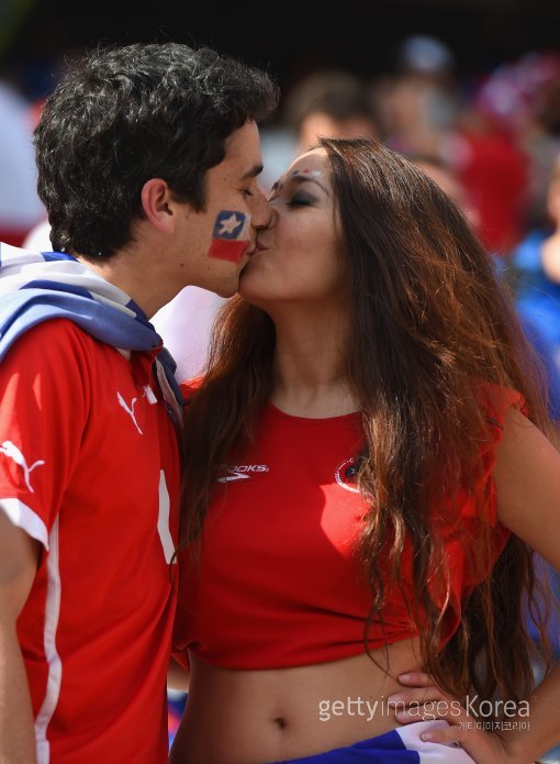 칠레 연인이 24일(이하 한국시간) 브라질 상파울루 코린치앙스 경기장에서 열린 2014 브라질 월드컵 조별리그 B조 3차전네덜란드전에서 키스를 나누고 있다.