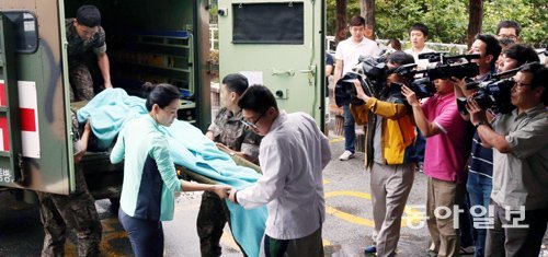 강원 고성군 22사단 예하 일반전방소초(GOP)에서 총기를 난사하고 무장 탈영한 임모 병장이 탈영 3일째인 23일 오후 군 당국과 대치하다 자살을 기도해 군 의료진에 의해 강릉아산병원 응급실로 이송되고 있다. 임 병장은 K-2 소총으로 자신의 왼쪽 가슴을 쐈지만 생명엔 지장이 없는 상태라고 국방부는 밝혔다. 고성=최혁중 기자 sajinman@donga.com