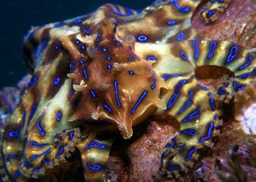 파란고리문어는 몸길이가 10cm 정도의 작은 크기지만 복어류가 지닌 테트로도톡신을 함유하고 있다.