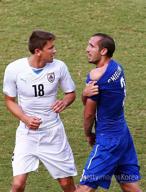 조르지오 키엘리니(이탈리아)가 25일(한국시각) 오전 1시 브라질의 에스타디오 다스 두나스에서 열린 2014 FIFA 브라질 월드컵 D조 3차전 우루과이와의 경기에서 어깨를 잡고 항의하고 있다.
