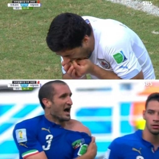 이날 수아레스는 0-0으로 맞선 후반 33분경 이탈리아 수비수 키엘리니와 충돌하면서 핵이빨을 드러내 그의 어깨를 깨물었다.