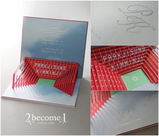 청첩장의 색상은 꿈의 결혼을 의미하는 스카이 블루와 구장의 열정을 연상시키는 크림슨 레드로 이루어져 조화를 이룬다.