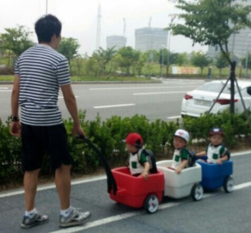 공개된 사진 속 송일국은 대한-민국-만세 세쌍둥이의 유모차를 끌고 있다. 특히 유모차는 아이들의 이름과 어울리게 태극기 색깔이어서 보는 이들에게 재미를 주고 있다.