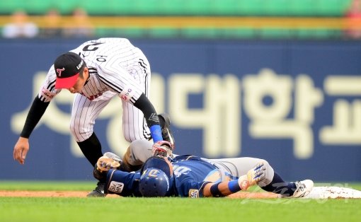 25일 서울 잠실야구장에서 ‘2014 한국야쿠르트 세븐 프로야구’ LG 트윈스와 NC 다이노스의 경기가 열렸다. 3회초 2사 1루에서 NC 나성범 타석 때 1루주자 이종욱이 2루 도루에 성공하고 있다.