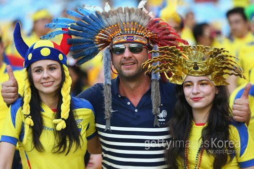 26일(한국시간) 브라질 리우데자네이루의 에스타디오 두 마라카낭 경기장에서 열린 2014 브라질 월드컵 조별리그 E조 최종 3차전 에콰도르-프랑스 경기에서 팬들이 열띤 응원을 하고 있다.
