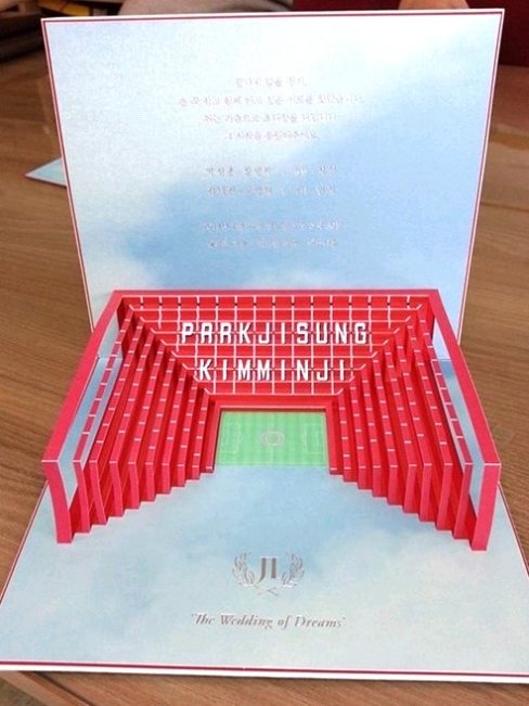 공개된 박지성 김민지 청첩장은 축구장 모양의 팝업 형식으로 꾸며져 있다. 특히 박지성의 맨유 시절을 떠올리게 하는 맨체스터 유나이티드의 경기장 모양이라 눈길을 끈다.
