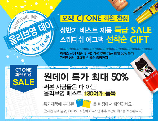 올리브영은 이날 단 하루, CJ ONE 회원을 대상으로 상반기 베스트 제품 130종을 최대 50% 저렴한 가격에 판매한다.