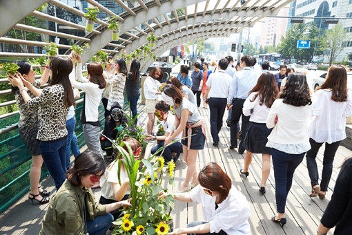 게릴라 가드닝은 도시 속 버려진 땅을 정원처럼 아름답게 가꿈으로써 새로운 의미를 부여하는 친환경 활동이다. 아모레퍼시픽 임직원은 이날 고객들로부터 수거한 화장품 공병과 오설록 테이크아웃 컵 등을 재활용해 청계천 삼일교 일대를 작은 정원으로 조성했다.